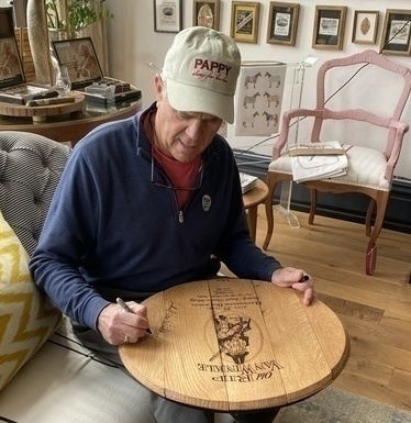 This extremely rare authentic 25 Year Pappy Van Winkle Bourbon Barrel Head has been refurbished, engraved, and signed by Julian Van Winkle III. The barrel head is reinforced for stability, so it can be hung on the wall, and it's backed with felt so it can rest comfortably on a table or ottoman. Even as the wood gradually dries out, the aroma of the whiskey still lingers. With your barrel head comes a certificate of authenticity and is signed by Julian Van Winkle III.
